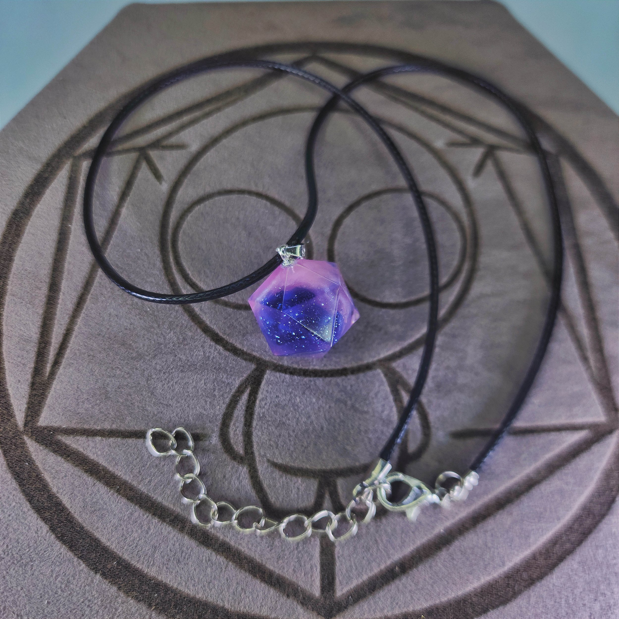 Os pingentes de nossos cordões são mini d20 lisos com apenas o 1 riscado em uma das faces, todos feitos de resina epóxi. Os cordões são feitos de couro sintético trançado ajustável de 45cm. O pingente foi desenvolvido em tamanho pequeno para melhorar a usabilidade, visando o conforto do usuário! Os detalhes técnicos do pingente são: