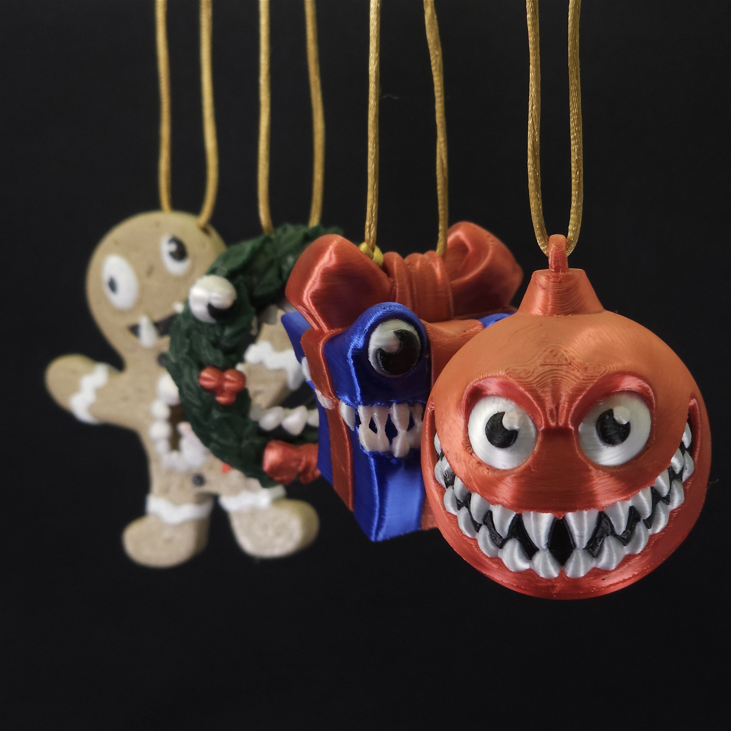 Enfeites natalinos impressos em PLA Silk. Cada conjunto acompanha 4 enfeites diferentes de mimic da mesma cor, 1 bola Vermelho Metálico, 1 Presente, 1 Guirlanda e 1 Coockie. As peças já seguem com a cordinha para pendurar, é tirar da caixa e colocar na árvore!